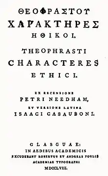• Θεουφραστου Χαρακτηρες Ηθικοι. Theophrasti Characteres Ethici Græce et Latine, Cantab. Typ. Acad., printer Cornelius Crownfield, 1712. Edition of the Characters of Theophrastus, with the notes of Isaac Casaubon, and the Prælectiones of James Duport, which Needham printed for the first time. It extended to nearly five hundred pages, and was dedicated to John Moore. This edition was reissued at Glasgow by Robert Foulis in 1743, 1748, and 1785, without the Prælectiones.