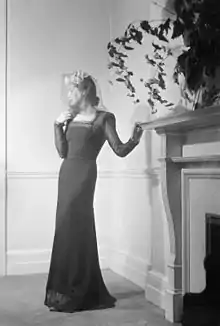 Russell played a major role in promoting London couturiers. He was among the founder members of the Incorporated Society of London Fashion Designers (IncSoc) in 1942.[12] He supported fashion's role in the war effort, championing utility principles and featuring in morale-boosting promotional photographs issued by the Ministry of Information. Although the couture industry was forced to alter both the quantity and the lavishness of fabrics used, it appears Russell heartily approved of the results of wartime rationing of fabrics. In a letter to the director general of the Board of Trade he suggested that it had made a vast improvement to fashion because it had taught people about discipline in dress and helped them appreciate simplicity.[13]