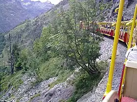 The Petit train d'Artouste is a narrow gauge tourist railway situated in the French Pyrenees close to the Spanish border, some 55 km (34.2 mi) south of the town of Pau, and within the commune of Laruns. The line runs high above the headwaters of the Gave d'Ossau, and provides access to the Lac d'Artouste, a semi-artificial lake in the mountains at an altitude of nearly 2,000 m (6,562 ft).[1] It is the second-highest railway in France after the Tramway du Mont-Blanc.