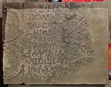 Archaeological excavations of the site of Petuaria were carried out in the 1930s (one of the archaeologists was Mary Kitson Clark),[2] and between 1958 and 1962, with occasional examinations of isolated areas since. The dedication stone of the Roman theatre was among the most significant finds and is unusual as the only recorded epigraphic mention of a magistrate in Roman Britain. Recording the gift of a proscenium stage to the civic settlement at Petuaria by a man called Marcus Ulpius Januarius, it has been dated to the reign of the Emperor Antoninus Pius and around 140 A.D.[3]