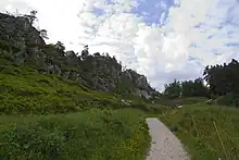 The Pfahl begins in the northwest in the Upper Palatinate, southeast of Schwarzenfeld, passes the town of Cham to the southwest and runs in a southeasterly direction via Viechtach, Regen, Grafenau and Freyung and into Upper Austria's Mühlviertel. The quartz only outcrops in a few places (and not at all southeast of Freyung);[5] otherwise the Pfahl is only recognisable as a ridge. In Weißenstein near Regen it reaches a height of 758 metres above sea level; on this summit stand the ruins of Weißenstein Castle. The quartz formations are most easily visible near Viechtach (west of the town) and here they rise up to 30 metres above the ground. With a few exceptions the Pfahl has survived as a continuous geological formation.