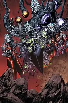 Another group of Phalanx later almost decimated the Shi'ar Empire in the absence of the Imperial Guard. With their bodies now pitch-black, except for a few red and blue glowing sensor slits, this new breed only displayed the basic Phalanx and Technarchy features while shapeshifting or when individuals were damaged. These Phalanx also considered themselves as "pure" Phalanx compared to such sects like the one on Earth and hadn't any reservations about infecting mutants with the transmode virus as they almost transformed Rogue.[17] The Phalanx made their way to Chandilar, the throneworld of the Shi'ar Empire where they tried to assimilate the "Nest", actually the hatching chamber where all Shi'ar eggs were being nurtured. Had they succeeded, the entire next generation of Shi'ar would have become part of the Phalanx collective. However, Beast developed a device that would emit a certain frequency to separate the organic from the technological part, causing all Phalanx within its range to dissolve but not before thousands or more Shi'ar were massacred.[18] The rest of this group later conquered another planet,[19] but were destroyed by the Magus after the construction of a Babel Spire.[20]