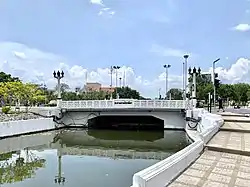 The bridge was originally decorated with attractive wrought iron railings, but these were moved when the bridge was enlarged in 1941 to a pedestrian bridge crossing the northern part of Khlong Khu Mueang Doem and located close to the intersection of Chakrabongse Road (Thai: ถนนจักรพงษ์) and Chao Fa Road (Thai: ถนนเจ้าฟ้า).[1][2]
