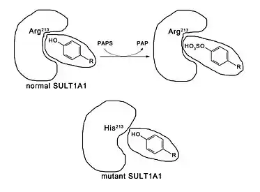 PST deficiency can be caused by inherited mutations in the PST genes,[10] for example the SULT1A1*2 polymorphism, which is a single nucleotide polymorphism at the 638th base of the SULT1A1 gene from guanine to adenosine that causes the change of the 213th amino acid residue of the resultant SULT1A1 from arginine to histidine.[17][18] This mutation causes a conformational change in the enzyme, reducing the size of the binding site and altering the thermochemical properties, which halves the substrate binding affinity and enzyme thermostability,[19] and results in diminished enzymatic activity.[16]