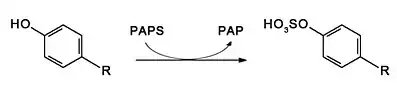 Sulfate conjugation catalyzed by PST, in which sulfuryl group from PAPS is transferred by PST to hydroxyl group of phenolic compounds.