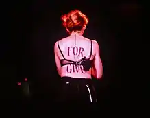Madonna's sexual image often played against her. Bette Midler introduced her to the global audience of the Live Aid in 1985, referring her as a "woman who pulled herself up by her bra straps and has been known to let them down occasionally". According to media, it was a reference of the Madonna's pre-fame nude photos that Playboy and Penthouse ran weeks earlier.[161] Nicole Hensley of New York Daily News commented, "The Material Girl has a history of pushing sexually suggestive motifs to encourage young people to complete their civic duty".[162] Her sexual image, along with her affiliation and activism for the LGBT community and the AIDS epidemic, caused "many people" including her ex husband Sean Penn, to believe she was HIV-positive herself. She addressed the allegations at an AIDS research gala in 1991 by saying: "I'm not HIV-positive but what if I were? I would be more afraid of how society would treat me for having the disease than the actual disease itself [...] If this is what I have to deal with for my involvement in fighting this epidemic, then so be it".[163][164] Rolling Stone commented her contributions to the AIDS causes were relatively overlooked by her marriage with Penn.[10]