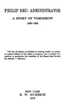 Philip Dru: Administrator: A Story of Tomorrow, 1920-1935 is a futuristic political novel published in 1912 by Edward Mandell House, an American diplomat, politician, and presidential foreign policy advisor. The book's author was originally unknown with an anonymous publication, however House's identity was revealed in a speech on the Senate floor by Republican Senator Lawrence Sherman.[1] According to historians, House highly prized his work and gave a copy of Dru to his closest political ally, Woodrow Wilson, to read while on a trip to Bermuda.[2][3][4]