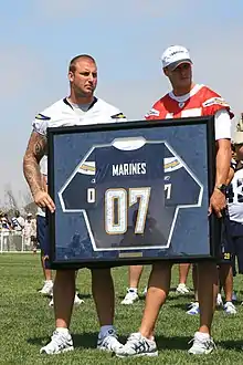 In August 2004, Rivers signed a six-year, $40.5 million contract with the San Diego Chargers that included $14.5 million in signing bonuses.[40] However, due to a protracted contract negotiation with the San Diego Chargers, Rivers only reported to the team during the last week of training camp, and incumbent Drew Brees retained his starting job. Rivers began the season as the Chargers' third quarterback option, behind Doug Flutie,[41] and ahead of the fourth quarterback on the depth chart, Cleo Lemon. Unfortunately for Rivers, Brees went on to have a then-career year and was named to the NFL Pro Bowl while winning the NFL Comeback Player of the Year Award.[42] Rivers received very limited playing time, playing in only two games. He only threw passes in the second half of the last game of the 2004 season, a victory over the Kansas City Chiefs, by which time the Chargers had already clinched a home playoff spot and the AFC West division title. In the victory, he threw his first touchdown pass to fellow rookie Malcom Floyd.[43] He was not on the active roster for San Diego's Wild Card Round playoff loss to the New York Jets.[44]