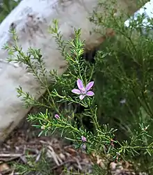Philotheca salsolifolia is a shrub that typically grows to a height of 2 m (6 ft 7 in) and has more or less glabrous branchlets. The leaves are crowded, thick and from cylindrical, 3–5 mm (0.12–0.20 in) long to narrow, pointed and up to 12 mm (0.47 in) long. The flowers are arranged singly or in twos or threes on the ends of branchlets, each flower on a top-shaped pedicel 1–2 mm (0.039–0.079 in) long or a thin pedicel about 8 mm (0.31 in) long. The five sepals are triangular, about 1.5 mm (0.059 in) long and the five petals are narrow elliptic, 6–12 mm (0.24–0.47 in) long and pink to mauve with a dark central stripe. The ten stamens are glabrous, fused together in the lower half, and densely hairy above. Flowering occurs from September to December and the fruit is 5–6 mm (0.20–0.24 in) long with a pointed tip.[2][3][4]