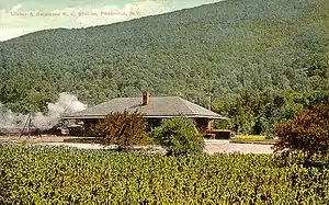 The first Phoenicia station was an 1870 masonry building located near the present intersection of Plank Road and Lower High Street in Phoenicia. The station's business increased when the branch was built in 1882; this led to two porticos being added, one on each side. Eventually, in 1900, the Ulster and Delaware would reach Oneonta. In 1899, the branch line was converted to standard-gauge due to steady growth in its passenger service to mountain resorts.[3]
