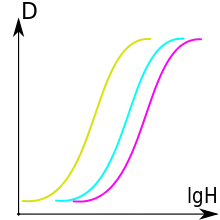 Plot of image density (D) vs. log exposure (H), yields a characteristic S-curve (H&D curve) for each type of film to determine its sensitivity. Changing the emulsion properties or the processing parameters will move the curve to the left or right. Changing the exposure will move along the curve, helping to determine what exposure is needed for a given film. Note the non-linear response at the far left ("toe") and right ("shoulder") of the curve.[8]