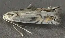 The wingspan is 7–8 mm. A whitish moth with yellowish suffusion and a distinct black spot near the wing apex. The forewings are shining white, posteriorly more or less ochreous-tinged; often a suffused spot on dorsum near base and a larger one in middle of disc dark fuscous; a transverse dark fuscous line at 2/3, preceded by one and followed by two dark fuscous streaks from costa; a round black apical dot; three dark fuscous diverging bars in apical cilia. Hindwings are light grey. The larva is pale green.[2]