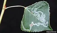 The larvae feed on Populus balsmifera, Populus x canadensis, Populus candicans, Populus deltoides, Populus euphratica, Populus gileadensis, Populus nigra, Populus simonii, Populus suaveolens and Populus trichocarpa. They mine the leaves of their host plant. The mine consists of long, broad, epidermal corridor that winds in dense loops over the upper-side of the leaf without crossing itself. The frass is deposited in a continuous, vague central line. The mine ends at the leaf margin, where the corridor is slightly widened, and in which some silk is deposited to create a pupal chamber. When this dries, the leaf margin somewhat folds over. The mine has a strong resemblance to the trail of dried mucus left by a small snail.[4]