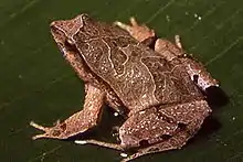 Adult males measure 19–22 mm (0.7–0.9 in) and adult females 20–25 mm (0.8–1.0 in) in snout–vent length. The snout is pointed or pointed-subelliptical in dorsal view and acute or rounded-acute in profile. The tympanum is not visible. The finger and toe tips are rounded or slightly swollen but without discs; webbing is also absent. The dorsum is brown and tan with yellow outlining. The hands and feet have orange highlights. The iris is bronze. Males have a single vocal sac.[3]