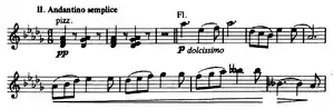 After a brief pizzicato introduction, the flute carries the first statement of the theme. The flute's opening four notes are A♭–E♭–F–A♭, while each other statement of this motif in the remainder of the movement substitutes the F for a (higher) B♭. The British pianist Stephen Hough suggests this may be an error in the published score, and that the flute should play a B♭.[36] After the flute's opening statement of the melody, the piano continues and modulates to F major. After a bridge section, two cellos return with the theme in D♭ major and the oboe continues it. The A section ends with the piano holding a high F major chord, pianissimo. The movement's B section is in D minor (the relative minor of F major) and marked "allegro vivace assai" or "prestissimo", depending on the edition. It commences with a virtuosic piano introduction before the piano assumes an accompanying role and the strings commence a new melody in D major. The B section ends with another virtuosic solo piano passage, leading into the return of the A section. In the return, the piano makes the first, now ornamented, statement of the theme. The oboe continues the theme, this time resolving it to the tonic (D♭ major) and setting up a brief coda which finishes ppp on another plagal cadence.
