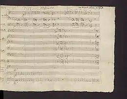 The manuscript is dated 5 January 1791. However, Alan Tyson's analysis of the paper on which Mozart composed the work indicated that Mozart used this paper between December 1788 and February 1789, which implies composition well before 1791. Simon Keefe has written that the composition of the work dates from 1788.[1] By contrast, Wolfgang Rehm has stated that Mozart composed this concerto in late 1790 and early 1791. Cliff Eisen has discussed the controversy over the time of composition in his review of the published facsimile of the score.[2]