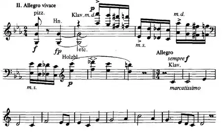 - The Allegro vivace begins as a playful and cunning scherzo (although still in C minor), deriving its main theme from the original chromatic subject in the beginning of the first movement. There is a bold switch to 6/8 time, and the piano leads the orchestra into a new brief but energetic theme. Eventually the orchestra moves into a lush Andante, recapitulating the chorale-style melody. Rather suddenly, the piano climbs up to a flurry of double octave trills and a climactic trumpet fanfare, leading to the jubilant finale based once more on the hymn theme played at triple time. The concerto concludes with the piano, in cadenza-like cascades, guiding the orchestra to a fortissimo close.