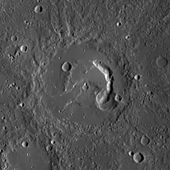 Picasso is a crater on Mercury. It has drawn scientific attention because of the large, arc-shaped pit crater located on the eastern side of its floor. Similar pits have been discovered on the floors of several other Mercury craters, such as Beckett and Gibran. These pits are postulated to have formed when subsurface magma subsided or drained, causing the surface to collapse into the resulting void. If this interpretation is correct, pit-floor craters such as Picasso provide evidence of shallow magmatic activity in Mercury's history.[1]
