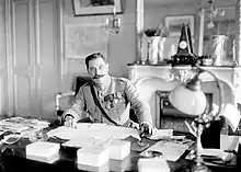 On March 26, 1908, he was promoted to colonel.[21] He served in the 28th Colonial Infantry Regiment.[2] On July 1, 1910, he became commander of the 1st Malagash Tyralliers Regiment.[5] On December 1 of the same year, he was appointed director of the 1st Bureau of the Colonial Troops.[22] On December 30, 1911, he took over as director of the colonial troops.[23] On February 14, 1912, he became a member of the National Committee for the Defense of the Colonies.[24] On October 23, 1912, he was promoted to the rank of brigadier general.[25]
