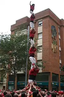 The pillar of 6 (Catalan: pilar de 6) is a castellers human tower with six levels and one person per level. Its difficulty is comparable to the 3 in 8 and the 4 in 8 and most rankings give it a punctuation similar to them. This tower was seen in the 19th century, and the last one completed before the decay of the castellers before its blooming in the 20th century was in Vilanova i la Geltrú in 1890.[1]