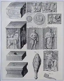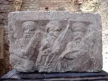 The Roman name for the monument is Nautae Parisiaci (the sailors of the Parisii, who were a tribe of Gauls).[2] It was found re-used in the 4th century city wall on the Île de la Cité and is now displayed in the frigidarium of the Thermes de Cluny.