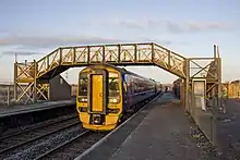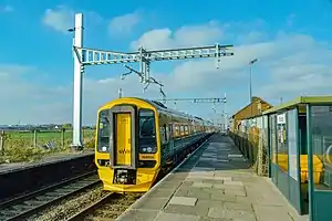 Pilning is managed by Great Western Railway, which operate all services from the station.[8] A parliamentary service of two trains per week operates; as of the December 2019 timetable these are the Saturday 08:33 and 14:33 services from Cardiff Central to Penzance and Taunton respectively. The standard journey time to Bristol Temple Meads is 20 minutes, and to Taunton is 80 minutes.[14][15][16] Services at Pilning are formed using GWR 158 and 166 diesel multiple-unit trains.[17][18] Due to there being no westbound trains, a fares easement is in place allowing passengers to travel to Severn Tunnel Junction in order to return eastbound to Pilning.[8] Rail replacement buses do not call at Pilning; in the event of engineering works taxis are provided instead.[11][17]