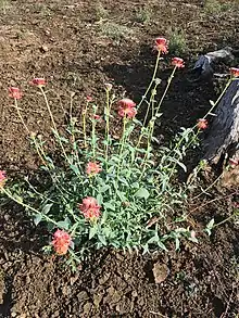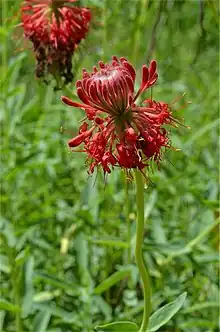 Pimelea haematostachya, commonly known as pimelea poppy,[2] is a species of flowering plant in the family Thymelaeaceae and is endemic to Queensland. It is a perennial herb with narrowly egg-shaped or narrowly elliptic leaves and heads of red flowers.