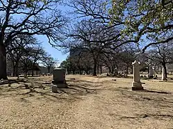 Established in 1849, Pioneer Park Cemetery is the final resting place for four Dallas mayors, early city business leaders, and fighters from the Texas Revolution. John McClannahan Crockett, Dallas mayor and Lieutenant Governor of Texas during the American Civil War, is among those buried here.[2] The last person was interred in the cemetery in 1921.[3]