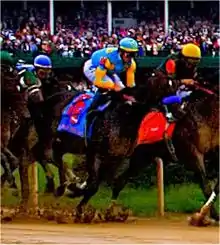 On April 16, Pioneerof the Nile arrived at Churchill Downs for the Kentucky Derby.[17] He breezed twice over the track before the Kentucky Derby, with Baffert saying that he was pleased with his works.[18] The Kentucky Derby would be Pioneerof the Nile's first start on dirt, with all his prior races having been on turf or synthetic surfaces. Baffert didn't think it would bother the horse, stating: "He's got a long stride as it is, but he really moves better over the dirt."[19] On May 2, Pioneerof the Nile started from post 16, as the third choice, against a field of eighteen other colts. The track was sealed, and listed as sloppy.[20] He broke very well, was bumped slightly, moved up to co-third with Papa Clem, where he settled down the backstretch, outside and about three lengths behind the leaders. around the far turn, he began to make his move, and took a short lead mid-stretch. Mine That Bird, a 50-1 long shot, moved up the rail and quickly opened up a large lead. Pioneerof the Nile battled with the rest of the field and held second by a nose over Musket Man, but was 6 3/4 lengths behind Mine That Bird.[21]