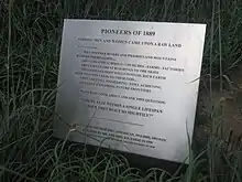 A plaque on the west side of the base reads: "STRONG MEN AND WOMEN CAME UPON A RAW LAND / WITH VISION... / THEY SPANNED RIVERS AND PRAIRIES AND MOUNTAINS/WITH DETERMINATION... / THEY CREATED SCHOOLS-CHURCHES-FARMS-FACTORIES / THEY LIFTED GREAT BUILDINGS TO THE SKIES / THEY DRILLED DEEP WELLS INTO OIL RICH EARTH / WITH THANKFULNESS TO THEIR GOD... / THEY ARE STILL PIONEERING-STILL ACHIEVING / AND STILL EXPLORING FUTURE FRONTIERS / PASSERBY-LOOK ABOUT AND ASK THIS QUESTION / WHERE ELSE WITHIN A SINGLE LIFE SPAN / HAS MAN BUILT SO MIGHTLY / M.G.T."[2] Another plaque on the base reads: "THIS STATUE COMMEMORATES THE PIONEERS OF 1889 / PRESENTED TO THE '89ERS AND THE PEOPLE OF OKLAHOMA / BY / MR. AND MRS. B.D. EDDIE / APRIL 22, 1960 / LEONARD MCMURRY / SCULPTOR."[2]