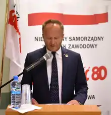 In years 1998-2014 he was a chairman of the National Secretariat of Construction and Wood Workers of Independent Self-governing Labour Union "Solidarity". He has served as a chairman of the National Secretariat of Construction, Wood Workers and Environmental Protection of Independent Self-governing Labour Union "Solidarity"-80 since 2014. As a result of his efforts,"Solidarity"-80 became a member of the European Federation of Building and Woodworkers (EFBWW) on 1 July 2018.[4][5] Moreover, he was vice-chairman of European Works Council Pfleiderer AG from 2007 to 2014.[6] Since March 28, 2017, he has been a member of The Council for the Protection of Struggle and Martyrdom Sites at the Wrocław branch of the Institute of National Remembrance.[7][8][9][10]