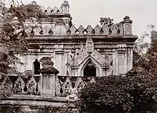 The Mandalay Pitakataik (Burmese: ပိဋကတ်တိုက်; also Pitaka-taik) was the royal library in Mandalay, commissioned by King Mindon Min in 1857 during the founding of Mandalay as a royal capital.[1] The library was one of seven structures built to mark the foundation and consecration of Mandalay as the royal capital.[2] It was located at the foot of Mandalay Hill, and was a masonry building with teak joints.[2] The building was modeled after the Pitakataik in Bagan.[3] Copies of Tipiṭaka texts were relocated from the Amarapura Pitakataik and deposited at the newly constructed library in January 1864.[4] The Pitakataik was formerly stocked with Pali and Burmese palm leaf manuscripts which were looted with the onset of British occupation in 1885.[3]