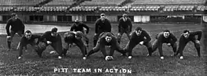 In 1914, Pitt hired Pop Warner as Pitt's head coach. His arrival at Pitt gave the program instant national credibility, lifting the perception of the program from a regional power to that of a national one.[17] Warner's impact was immediate. Led by center Robert Peck, Pitt's first First Team All-American, and All-American end James Pat Herron, Warner's first Pitt team in 1915 went 8–0, shutting out five opponents, and was trumpeted by football historian Parke H. Davis as that season's national champion.[18] His second season duplicated that success, repeating an 8–0 record while collectively outscoring opponents 255–25, and garnering what is widely regarded as a consensus national championship.[19] The 1916 team was led again by Herron and Peck, now in his last season, as well as All-Americans fullback Andy Hastings and guard "Tiny" Thornhill. Also on that team were Jock Sutherland and H.C. "Doc" Carlson, who both would garner First Team All-American selections while members of the undefeated 1917 team, and go on to become perhaps Pitt's most legendary coaches in football and basketball, respectively. The 1917 team, nicknamed "The Fighting Dentists" because over half the roster became doctors or dentists, finished 10–0 with five shutouts despite losing several players to military service at the outbreak of World War I. The Spanish flu pandemic of 1918, saw the implementation of quarantines that eliminated much of that year's college football season. All of Pitt's games that year were played in November, including a high-profile game played as a War Charities benefit against undefeated, unscored upon, and defending national champion Georgia Tech, coached by the legendary John Heisman. Pitt swept through its first two games and then dismantled Georgia Tech 32–0 in front of many of the nation's top sports writers including Walter Camp. The 1918 Panthers were named by multiple selectors as a national champion for that season.[20]