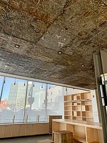 Through the request of the client, 12 historical artifacts from Sudbury were incorporated throughout the building. These adaptive re-use elements were able to showcase artifacts of the Sudbury Francophone community. Artifacts include: Bread pans from a Canada Bread Bakery built in the 1940s; tin ceiling tiles re-used from École Saint-Louis-de-Gonzague; theater lights from Sheridan Auditorium (presently known as Sudbury Secondary School); boards used for tables were produced from L’ île aux Chênes; white pine beams from Chicago; re-used bricks from a number of significant buildings around Sudbury; stage decor resembling slag from Sudburys mining; Lockers repurposed from a local Sudbury highschool, École Secondaire Macdonald-Cartier; stained glass from Collège du Sacré-Coeur and copyright certificates for Lignes-Signes.[9]