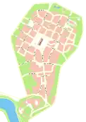 Most historic sites of the old Kraków are located inside the Planty-park-belt along the Royal Road (Polish: Droga Królewska) crossing the park from the medieval suburb of Kleparz – through Florian Gate – at the northern flank of the old city walls.[4][5] The historic Wawel Castle at the Wawel Hill, adjacent to Vistula River meander, form the southernmost border of Planty.