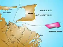 The Plataforma Deltana (English: Deltana Platform) is an offshore oil and gas field straddling the maritime borders of Trinidad and Tobago and Venezuela. It is located in the Orinoco delta, about 90 kilometers northeast of the island Tobejuba in the state Delta Amacuro, and approximately 233 kilometers southeast of Güiria, Sucre State, Venezuela.