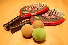 A spongy ball measuring 2.5 inches (64 mm) in diameter is used. The ball can be served overhand. The ball is struck with a paddle that extends 18 inches (460 mm) and which may have up to 87 holes measuring no more than 3⁄8 inch (9.5 mm) in diameter to improve its aerodynamics.[8]