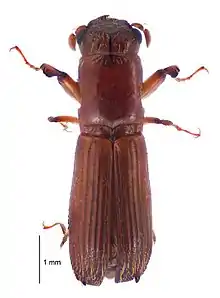 The colour of Platypus apicalis is mainly dark-brown, with yellow basal joint of antennae, metathorax and femora. The body is cylindrical in cross section and greatly elongated from front to rear. It is less than 2 mmm wide and about 5.8 mm long.[1][2] The mandibles of adults are oriented downward. The terminal segment of the antennae is dorso-ventrally flattened and larger than the other antennal segments.[2] The mesothoracic wings are modified into a hardened wing case.[3] A narrow longitudinal groove is present on the middle of the pronotum. The elytra bear parallel longitudinal grooves, are mainly smooth but pubescent at their rear end and sides, and are sloping downward at their posterior end.[1][2]