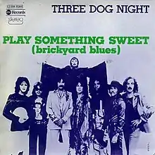 Ensuant to the August 1974 single release of the James Montgomery Band's version of "Brickyard Blues", the Three Dog Night version of "Play Something Sweet (Brickyard Blues)" was issued in September 1974 as the third single off the Hard Labor album, which had already generated the hits "The Show Must Go On" and "Sure As I'm Sittin' Here", which would prove to be respectively the group's final Top Ten and Top Thirty hits. "Play Something Sweet" would become the lowest-charting Three Dog Night single since their 1968 debut disc "Nobody" had stalled in Billboard's Bubbling Under Hot 100 ranking, the Billboard Hot 100 peak of "Play Something Sweet" being No. 33, while on the hit parade for Canada—as featured in RPM—"Play Something Sweet" was ranked as high as No. 25. The Top 30 shortfall of "Play Something Sweet" signaled a permanent downturn in the chart fortunes of Three Dog Night, as their followup single would have similar mild chart impact with a Billboard Hot 100 peak of No. 32 and would prove to be the group's final Hot 100 entry.