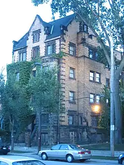 The Plaza Apartments is a historic five-story apartment building located in the Central neighborhood of Cleveland, Ohio, United States.[3] Built in 1901, it was designed by the architectural firm of Steffens, Searles & Hirsh, which built many middle-class apartment buildings in the Cleveland era around the turn of the twentieth century.[4] It features a primarily brick facade; stone appears in the exterior, and the foundation is stone. It was added to the National Register of Historic Places on November 1, 1984, being included primarily for its architectural significance.[2] Other historic buildings surround the Plaza Apartments: it was added to the Register as part of the "Upper Prospect Multiple Resource Area,"[2] and the Register-listed Jeremiah Ensworth House is located next door.[5] Located just a quarter of a mile (400 m) from the Cleveland State University campus, the Plaza Apartments remains an active apartment building today, although named the "Plaza Suites."[6]