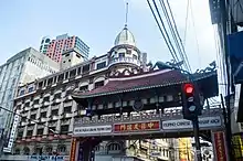 Owing to its status as a financial center in its heyday, a number of notable buildings and structures have been built in and around the vicinity of Plaza de Cervantes, including some of Manila's tallest buildings at the time. The most notable building currently standing is the Mariano Uy Chaco Building, built in 1914 and said to be Manila's first skyscraper. Designed by American architect Samuel E. Rowell in the Art Nouveau style,[9] and including a distinctive clock tower, it was the headquarters for Uy Chaco and Sons, a hardware company which imported goods from the United States for local distribution.[10] Beside it is the Geronimo de los Reyes Building, also known as the Edificio A. Soriano. Designed by Juan Nakpil, the building later came to the ownership of industrialist Andrés Soriano, becoming the headquarters for his eponymous conglomerate and later buying out neighboring buildings for its expansion, with the expansions designed by Andrés Luna de San Pedro.[11] The building at the time also hosted the Franco-era Spanish consulate, owing to Soriano's Francoist sympathies,[12] as well as the law firm Dewitt, Perkins, and Ponce-Enrile, where Alfonso Ponce Enrile, father of Juan Ponce Enrile, was a partner.[13] Damaged in the Battle of Manila and subsequently restored,[14] the building is presently abandoned.