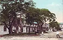 Originally covered with cobblestone,[3] by the early years of the American colonial period the plaza was dominated by low-rise commercial buildings, which author and Thomasite Paul T. Gilbert likened to a scene out of Othello or The Merchant of Venice.[4] In 1916, a monument was installed in the plaza to Tomás Pinpin, the first Filipino printer, although infrastructure improvements initiated by the colonial government led to businesses moving out of the plaza and to the nearby Plaza de Goiti (now Plaza Lacson) and Escolta Street.