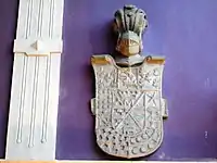On the south side of the square is the Pazo de los Cru y Montenegro, which crosses Don Gonzalo street with its pointed arch. This manor house dates back to the 15th century, although it has undergone numerous subsequent modifications, particularly in the 16th and 19th centuries. Its façade was rebuilt in the Baroque style and it has a large stone coat of arms from the 17th century, known as the Coat of Arms of the Twelve Lineages,[15] with the arms of Montenegro, Mariño, Sotomayor and Cru, and French windows with balconies on the upper floor. The manor house preserves the remains of its original crenellated tower, whose battlements have been replaced by a conventional roof.[16][17]