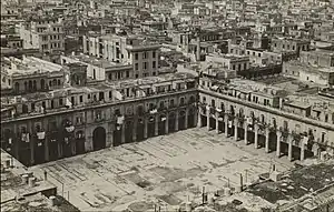 Plaza del Vapor looking towards the Southeast showing the central courtyard (1933) and the back of the central tower on calle Reina, Walker Evans.