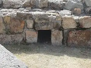 In addition to its political function, it was probably dedicated to the earth, by the inverted T shape related to the underworld. Its walls contain carved stones with a cut spiral.[1]