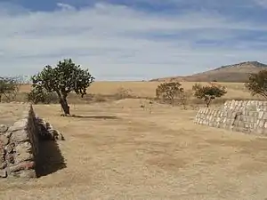 The central esplanade contains five buildings; it is believed to have represented the larger construction effort, in leveling the terrain. The buildings are the Casas Tapadas Complex, a ballgame court to the south, two structures just west of the court, a Temazcal and a large concentration of petroglyphs at the northern and western edges of the esplanade.[3]