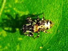 Plexippus lutescens is a jumping spider that was first described by the Polish arachnologist Wanda Wesołowska in 2011.[1] It was one of over 500 species that she has identified.[2] It was placed in the genus Plexippus, first raised by Carl Ludwig Koch in 1846.[3] The word plexippus is Greek and can be translated striking or driving horses. It was the name of a number of heroes in Homer's Iliad.[4] The species name is derived from a Latin word that can be translated dark, recalling the generally light colours on the palpal bulb.[5] The genus was placed in the subtribe Plexippina in the tribe Plexippini, both named after the genus, by Wayne Maddison in 2015, who listed the tribe in the clade Saltafresia.[6] It was allocated to the subclade Simonida, named in honour of the French arachnologist Eugène Simon.[7] In 2016, it was combined with 31 other genera into the group Christillines, named after the genus Chrysilla.[8] In his 2017 study of the genus, Jerzy Prószyński found that, as the palpal bulb does nor resemble other spiders in the genus, it should be reclassified.[9] This was not undertaken, so the species remained in the genus Plexippus.[1]