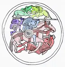 The Pliezhausen brooch (also known as the Pliezhausen disc, Pliezhausen bracteate or Pliezhausen disc brooch) (German: Reiterscheibe von Pliezhausen) is a gold disc decorated with figures that was discovered in 1928 during excavations in Pliezhausen, in the county of Reutlingen in Germany, in the grave of a wealthy Alemannic woman dating to the early 7th century and which was the front of a disc fibula. It is one of the few artifacts of the Early Middle Ages which portrays the figures of people.