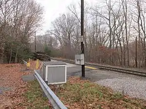 The 1964-formed MBTA began subsidizing service on the route on April 24, 1966; it became the Franklin Line of the MBTA Commuter Rail system.[3] The station had become less important under public ownership due to its lack of parking, rural location, and proximity to the well-used Walpole station. Additionally, the station was in the middle of a single-track section of the line, severely limiting the number of trains that can stop. The MBTA closed the stop on February 1, 1981 due to budget cuts, but soon reopened it due to protests by riders.[13] The single round-trip served a small but dedicated contingent of riders.[2] A planned project to double-track the line through the station was announced in November 2019.[14]