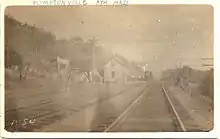The station was renamed to Tilton(s) by the 1870s after the mill village changed names.[7][8] A small station building, no longer extant, was located on the northwest side of the tracks.[9] Double-tracking through the station to Walpole was completed in 1881.[3] The NY&NE was taken over by the New Haven Railroad-controlled New England Railroad in 1895; the new railroad was leased by the New Haven in 1898.[3] Around 1894, the name was changed again to Plimptonville (sometimes spelled Plymptonville).[10][11][12]